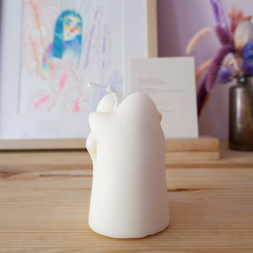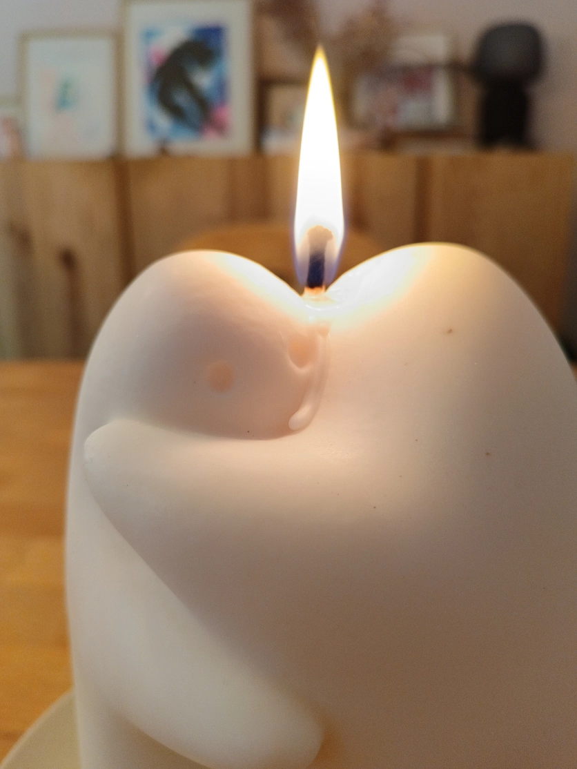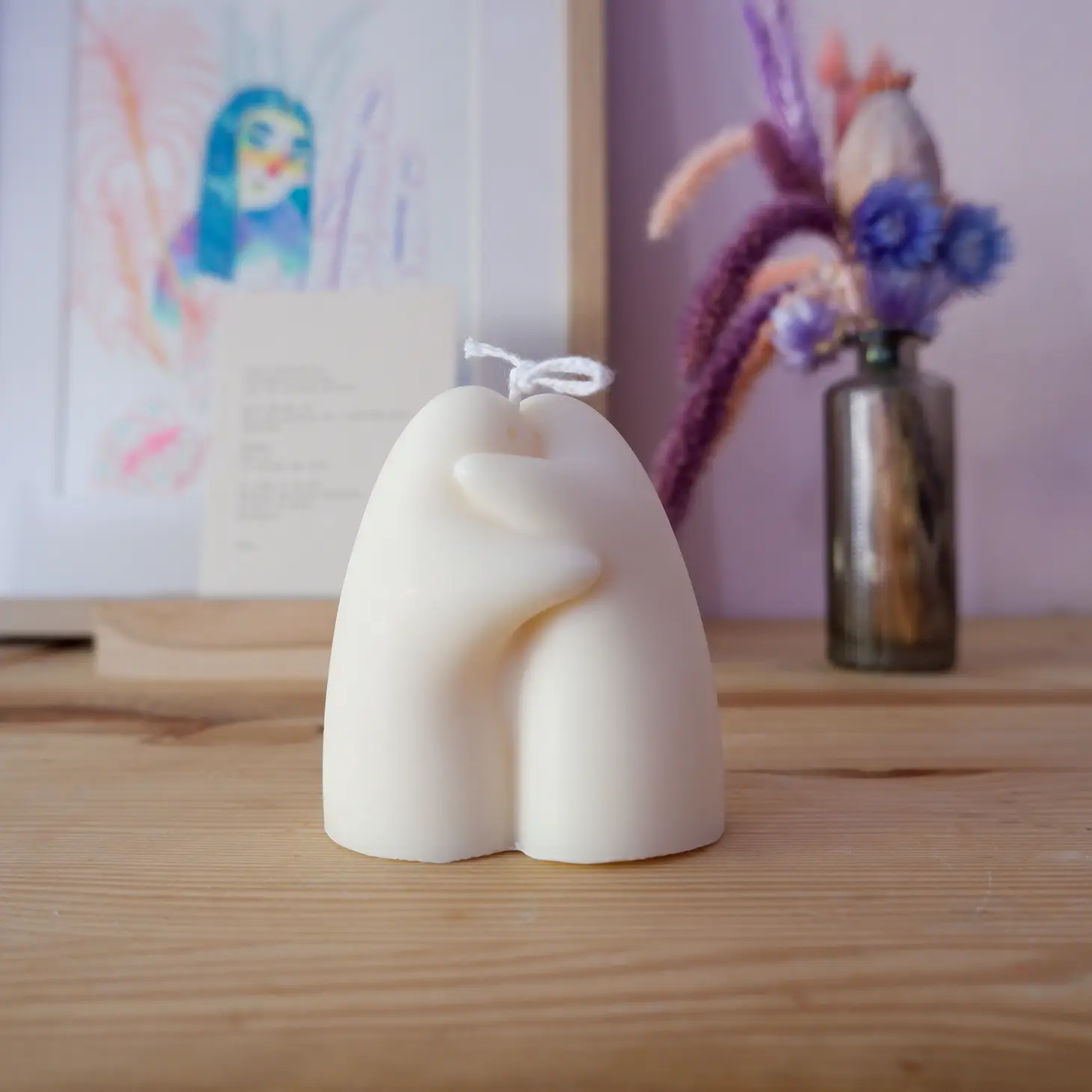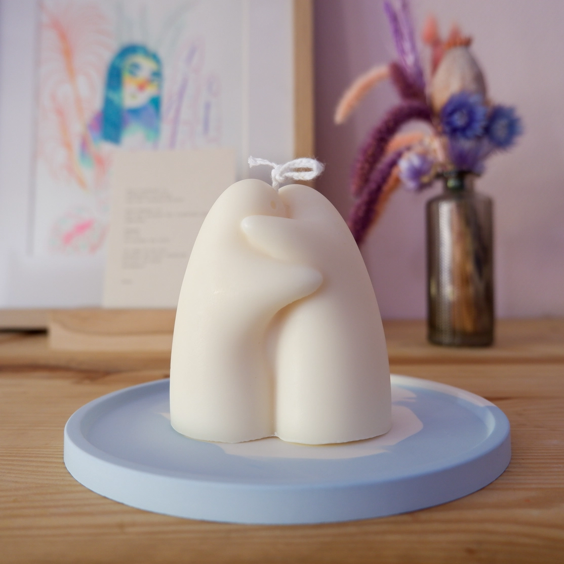 Twee knuffelende wezentjes omarmen elkaar in de vorm van een kaars. Als je de lont aansteekt, lijkt het alsof één van hen begint te huilen, terwijl de vlam tussen hun omhelzing danst. Het voelt als een warme omhelzing die emoties kan losmaken. Elke knuffelkaars is gemaakt van ecologische koolzaadwas en komt in twee maten: XS (2 uur brandtijd), M (10 uur brandtijd). Perfect om iemand een lichtpuntje te bieden. Vergeet niet om de kaars op een bordje te zetten om druipend kaarsvet te voorkomen.