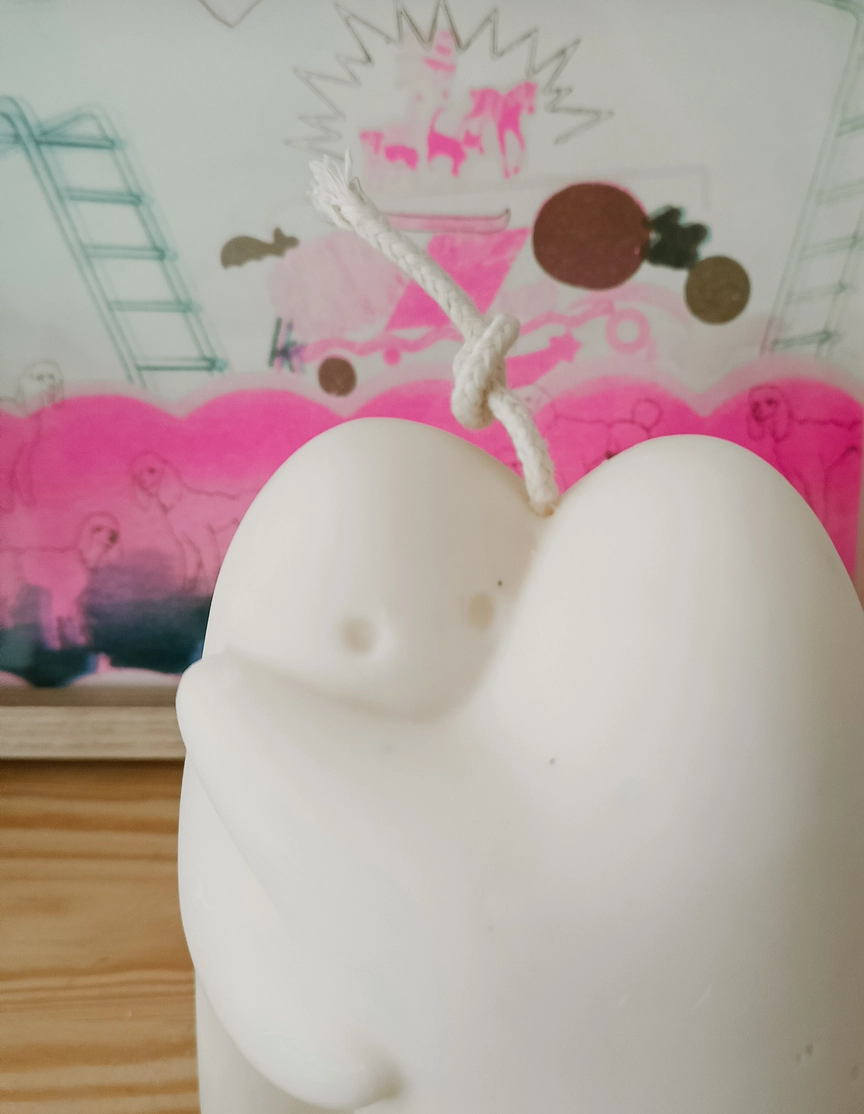 Twee knuffelende wezentjes. Als je de kaars aansteekt, is het precies alsof één wezentje begint te huilen. Hoe langer de kaars brandt, hoe meer je de vlam ziet branden tussen de knuffel door. Het voelt zoals het is: met een knuffel kan je zoveel emoties losmaken en beiden voelen de warmte van de ander. Je koopt niet gewoon een kaars maar een knuffel, een lichtpuntje voor iemand die er eentje nodig heeft.