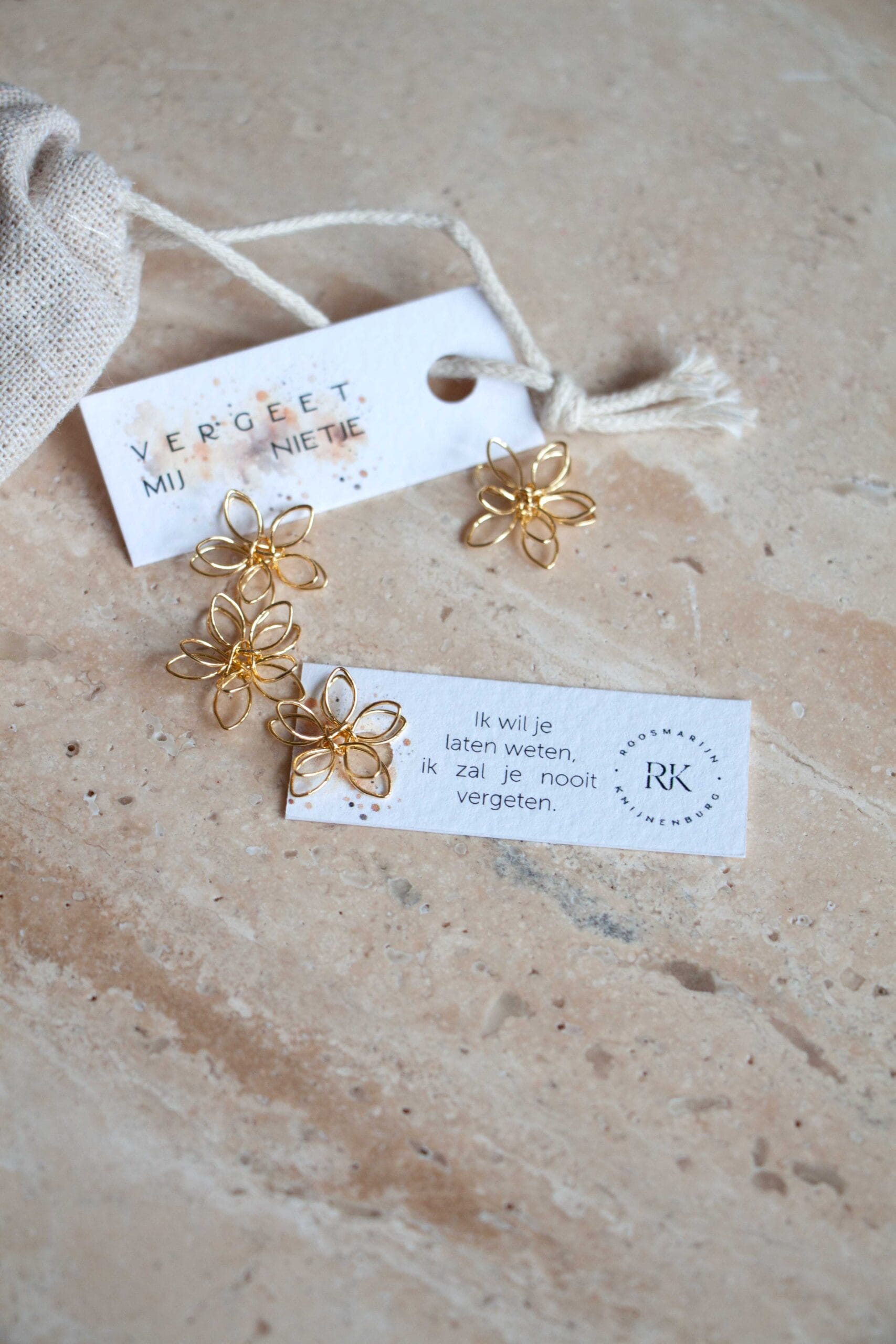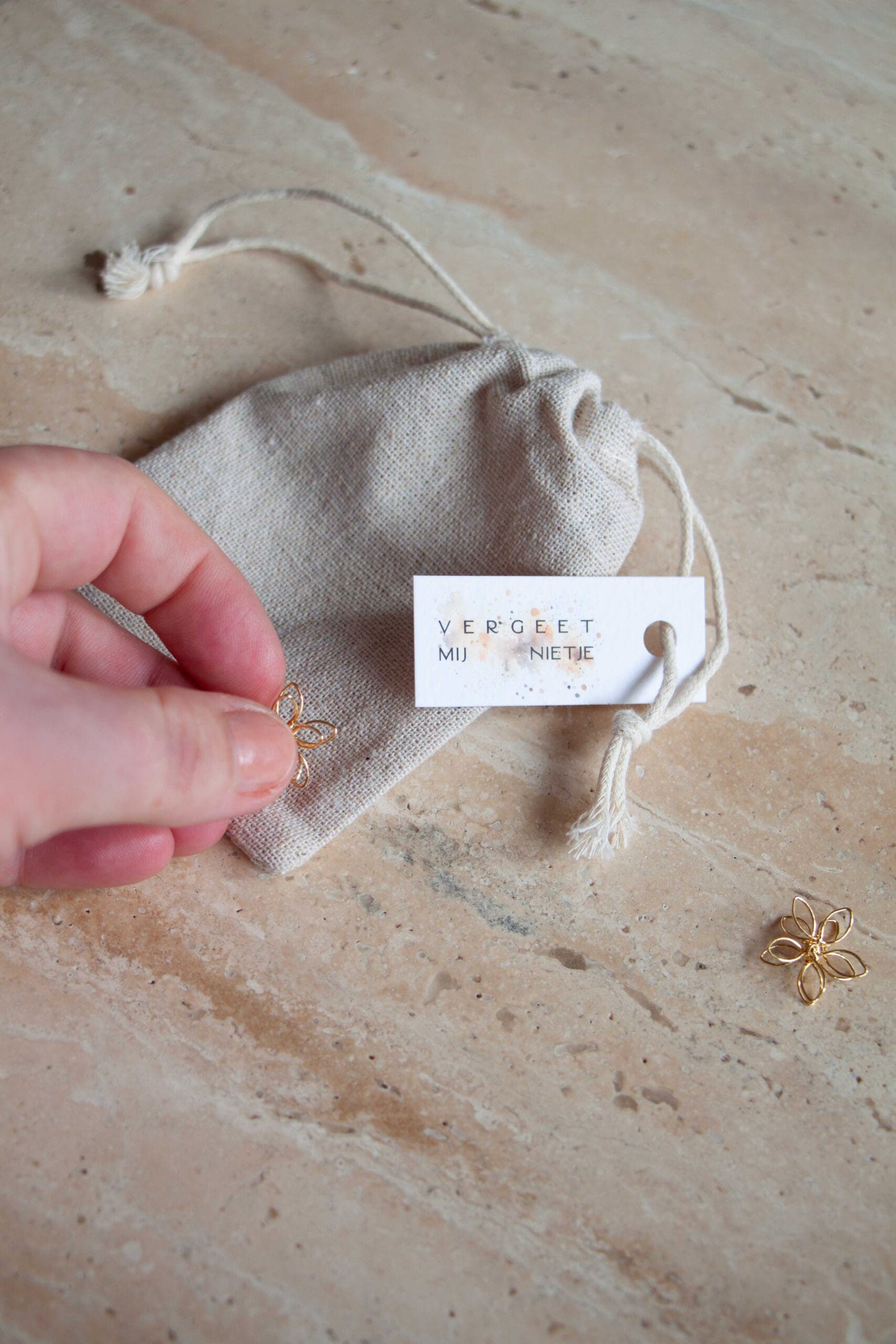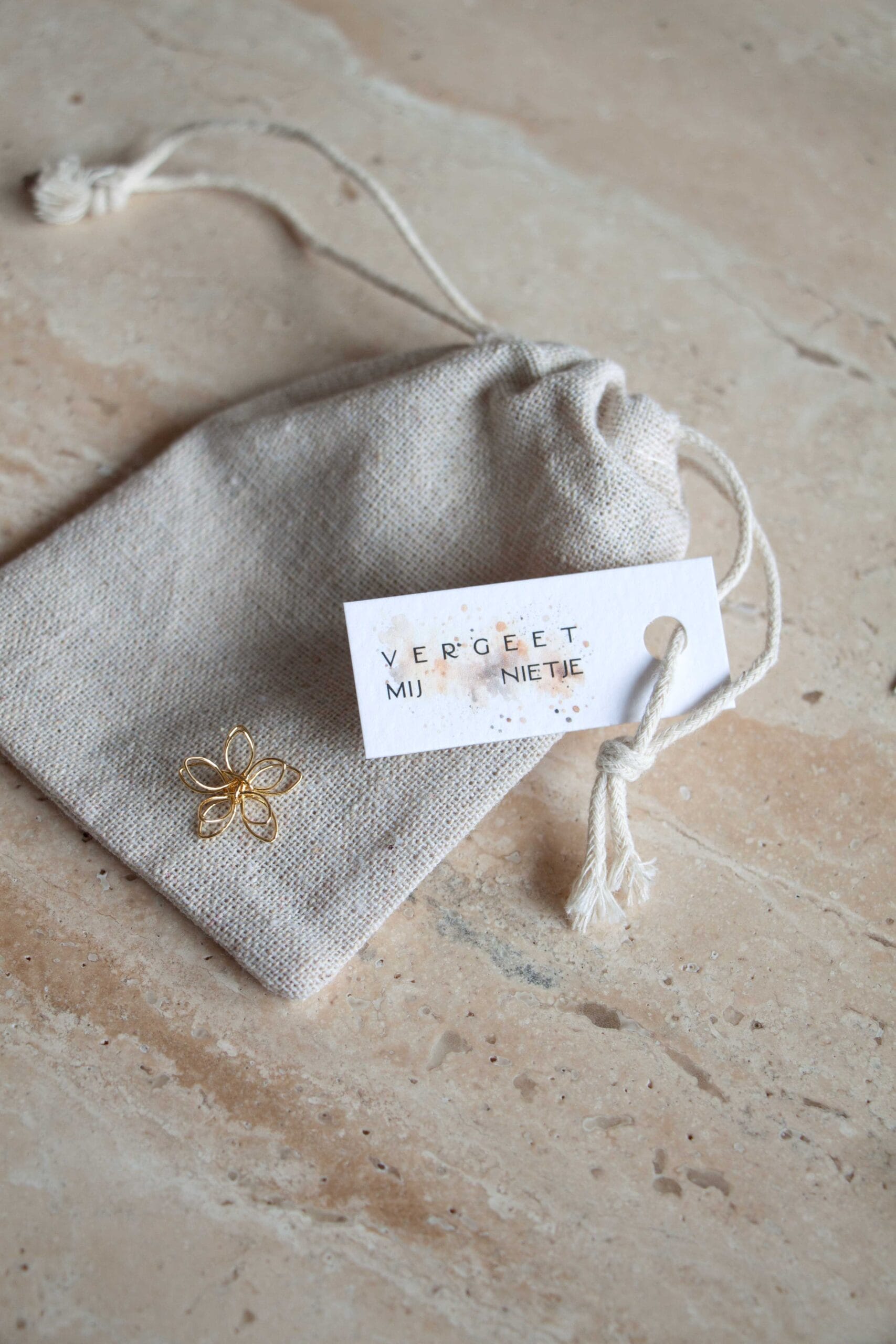 Een klein metalen bloemetje / vergeet mij nietje. Om bij je te houden en te kunnen pakken op momenten dat het even extra zwaar is. Verpakt in een linnen/katoen zakje.